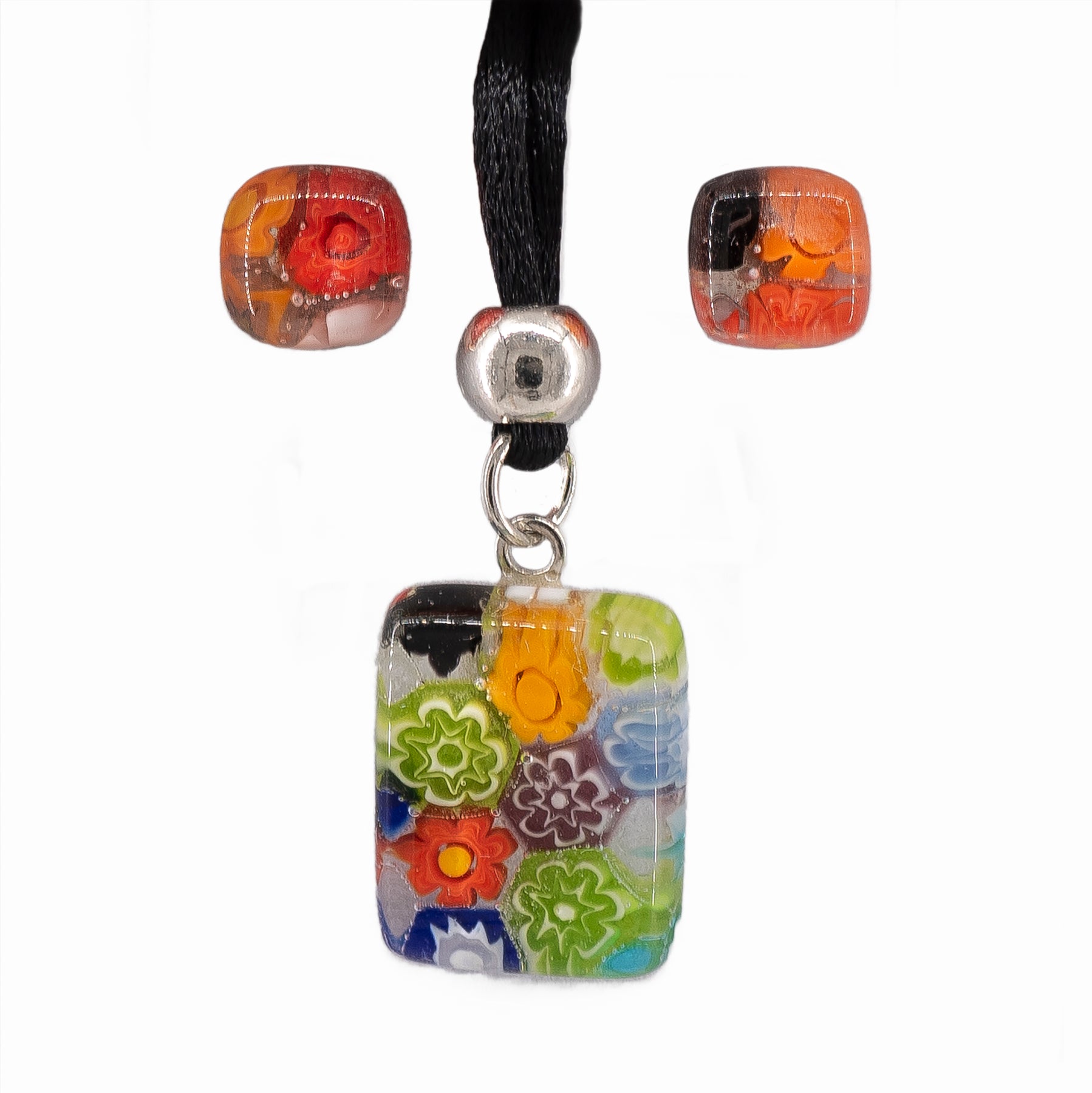Splendida parure in vetro di Murano composta da pendente e orecchini a lobo. Disponibile nelle colorazioni: verde, celeste e multicolor.