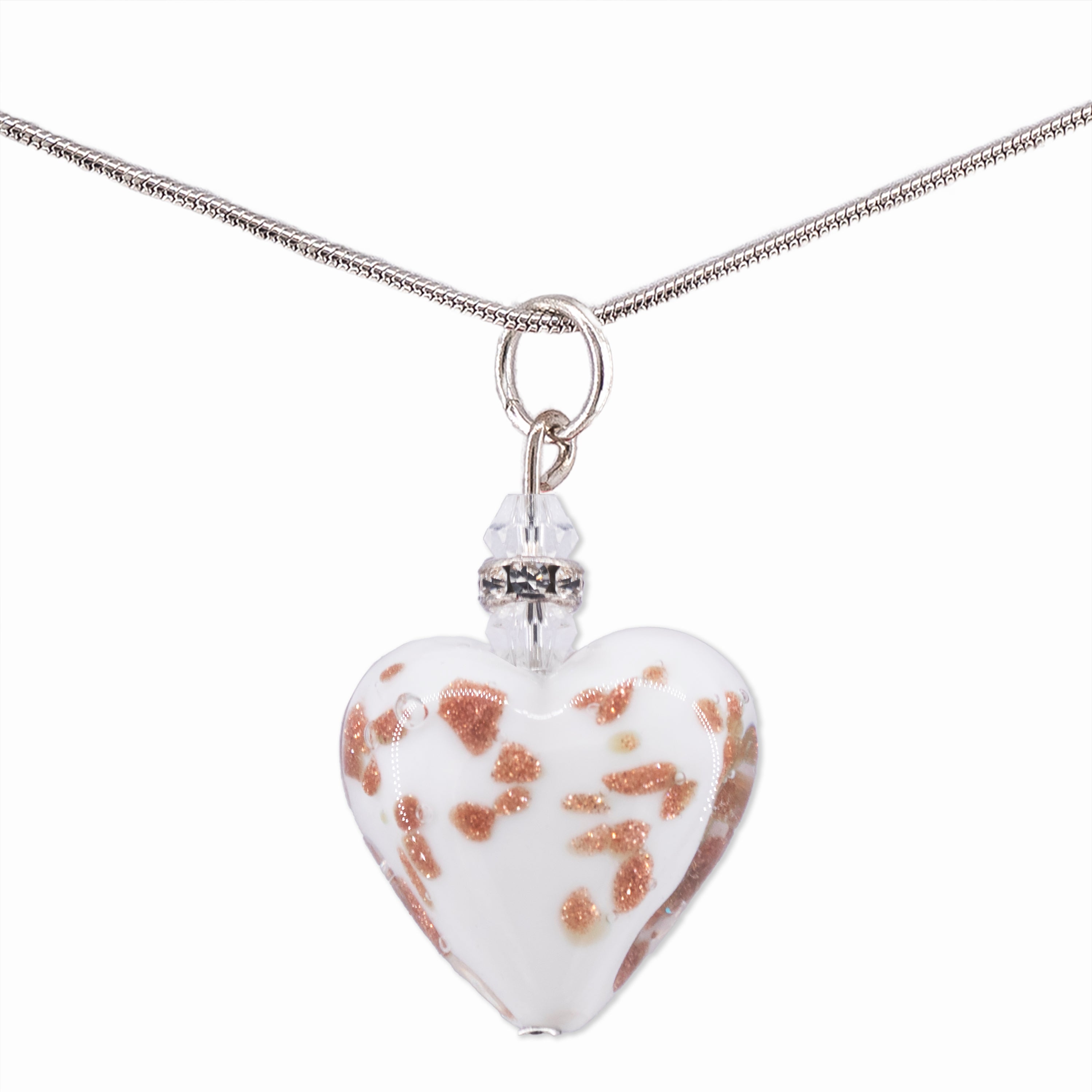 Raffinato pendente a forma di cuore in vetro di Murano. Il cuore è disponibile in tre diverse colorazioni pastello: rosa, rosso e bianco.